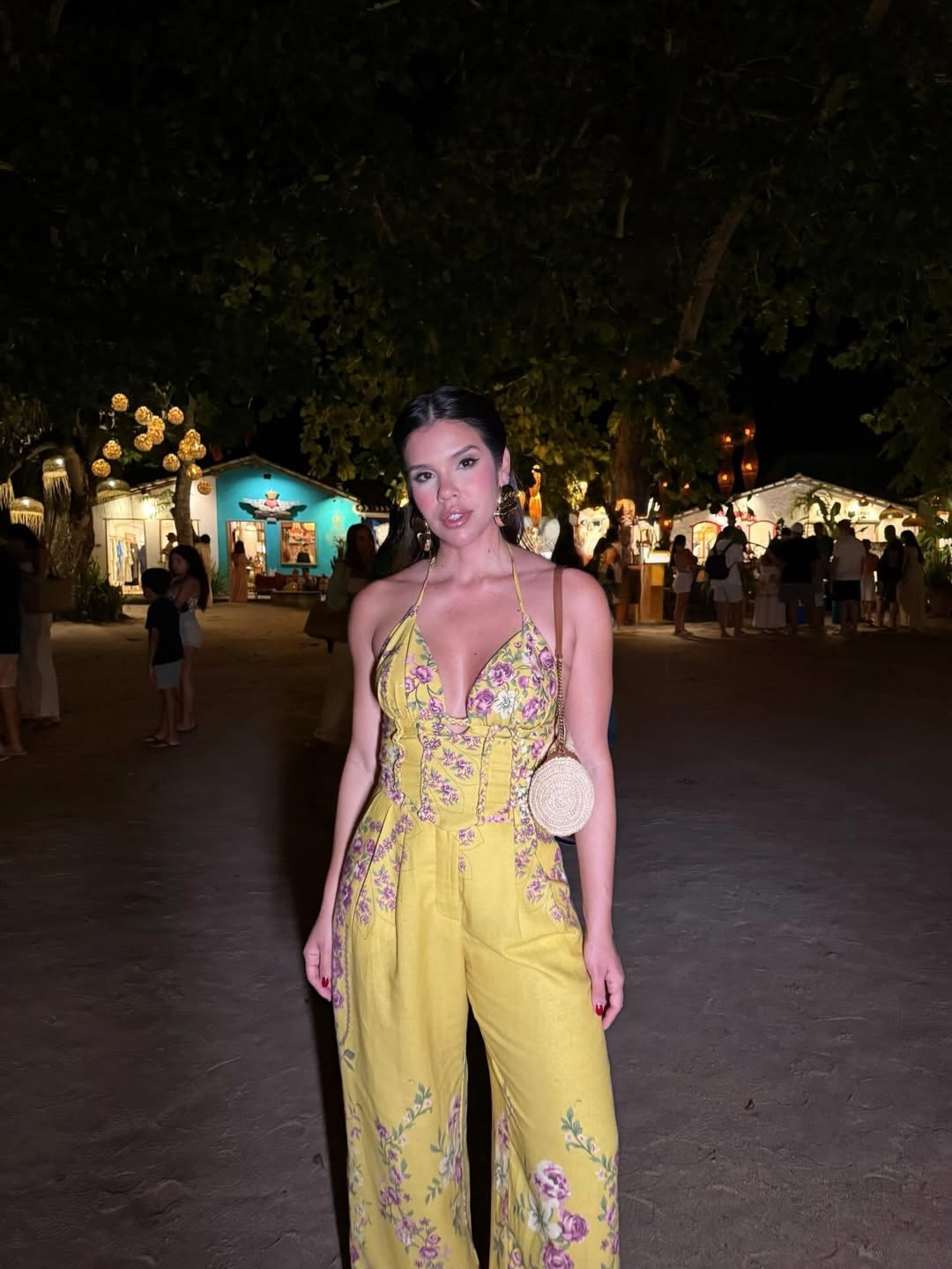 A corset and wide-leg pants suit adorned with gold floral patterns elevates a tropical look with its vibrant colors and effortless femininity.
