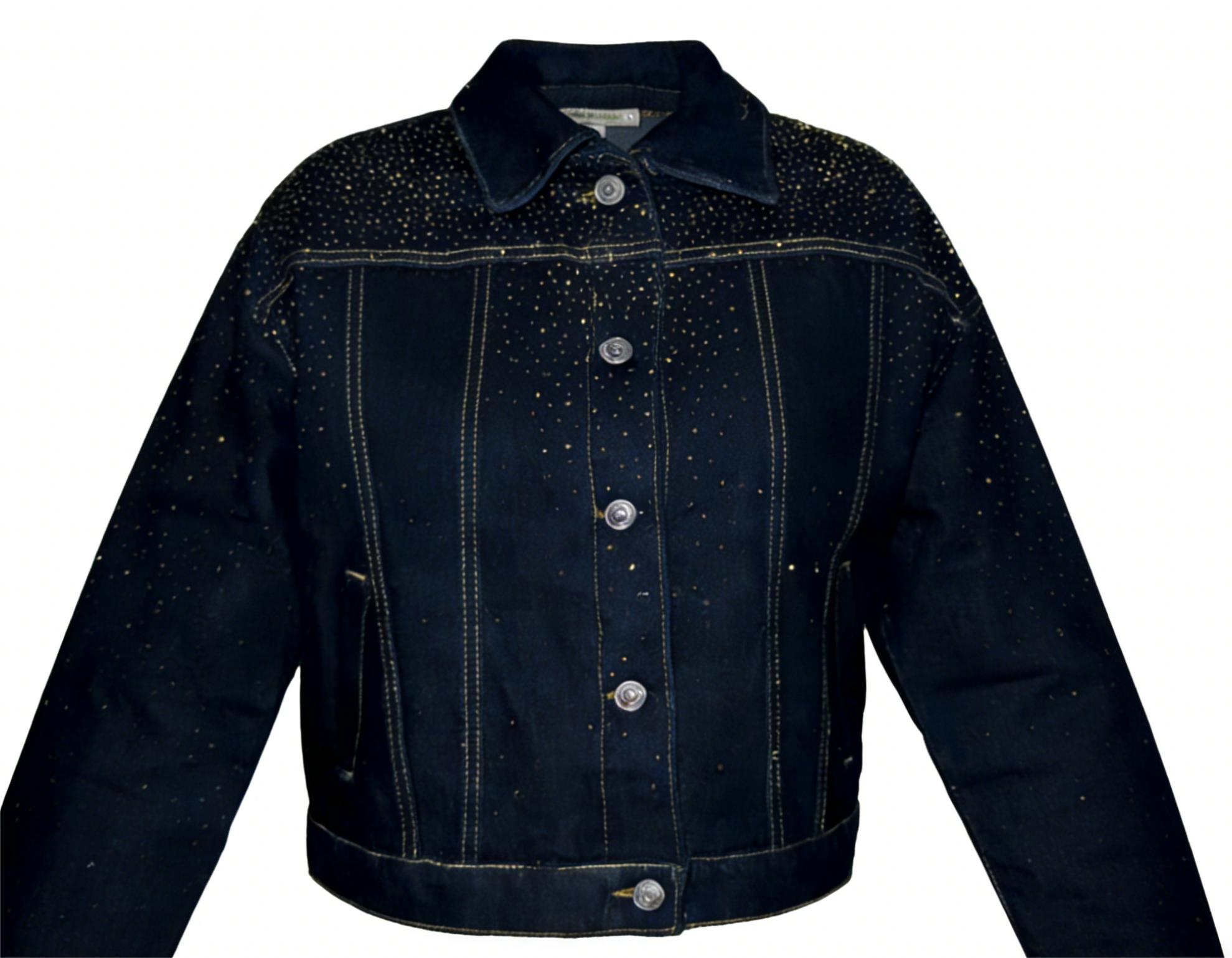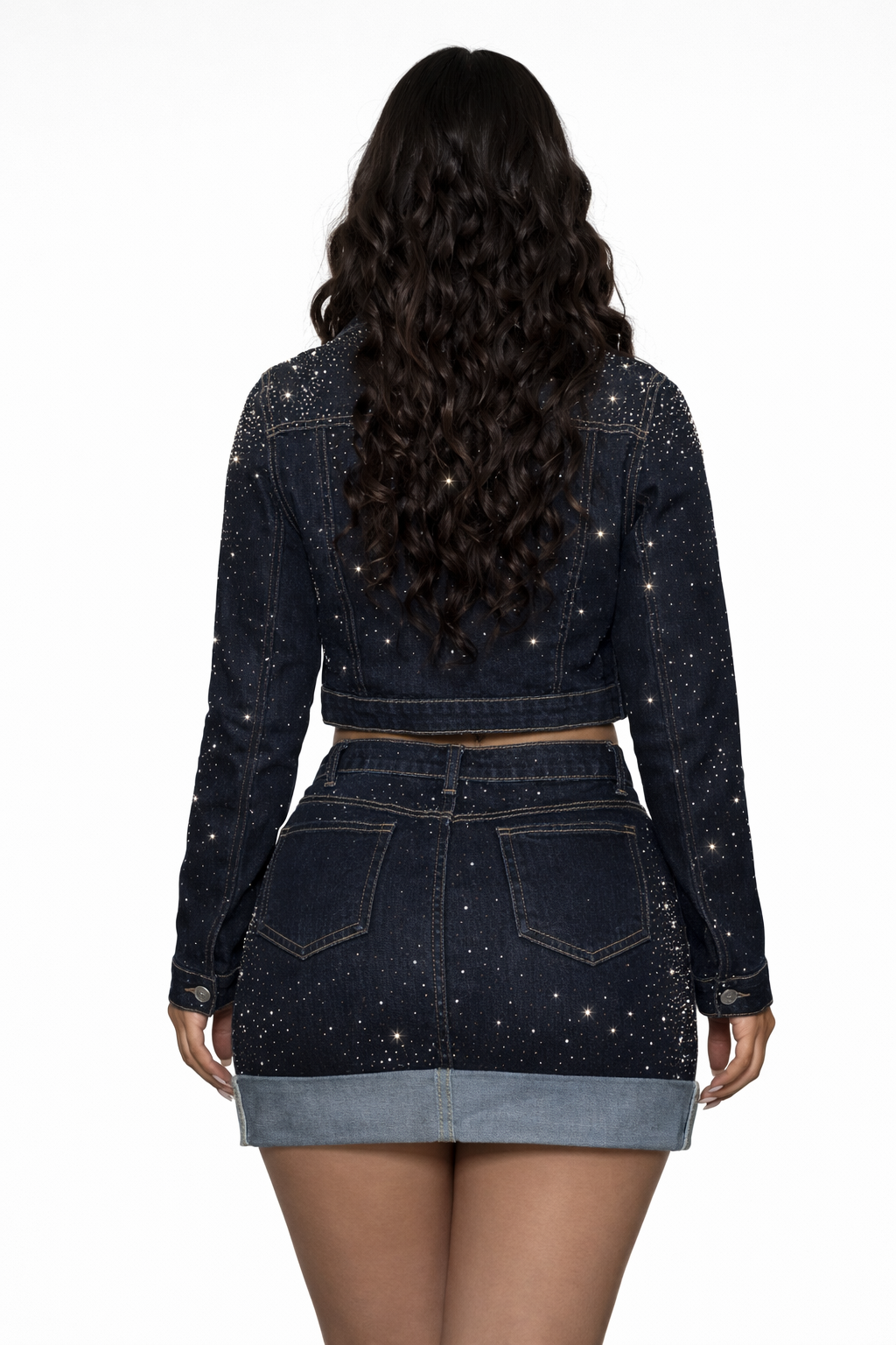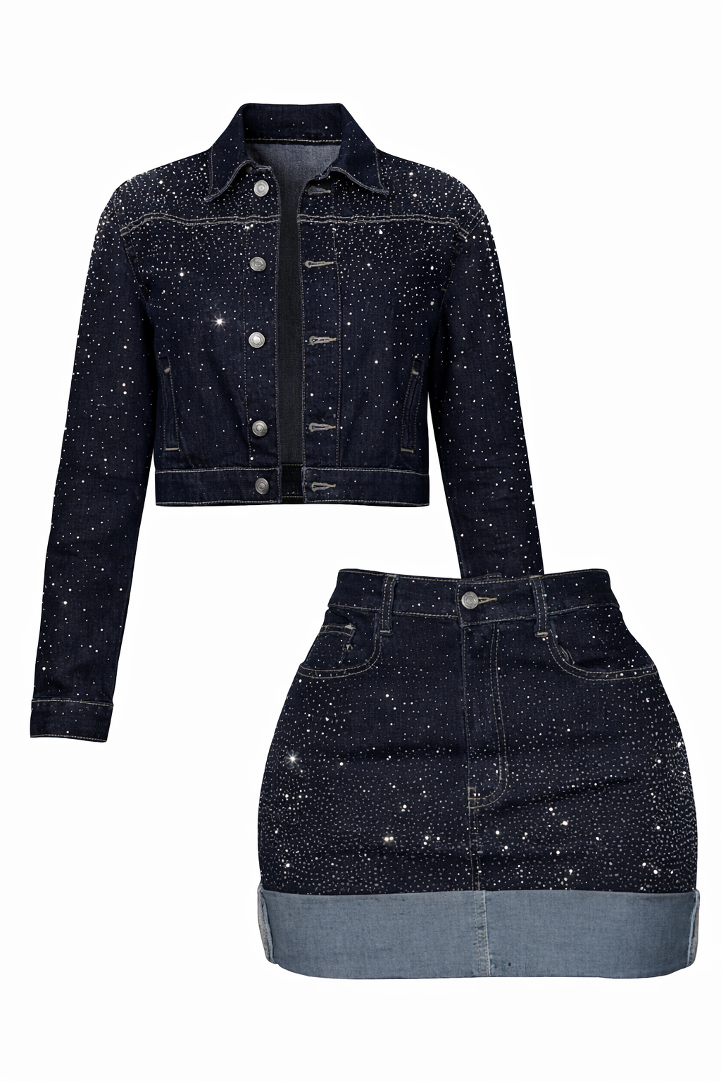 A navy blue sequined denim jacket and skirt set elevates the charm of casual wear with its shimmering texture and relaxed style.