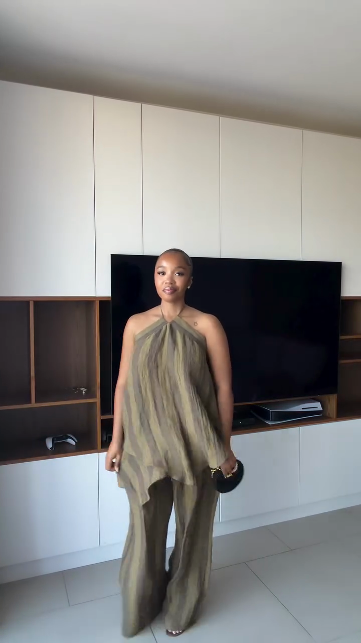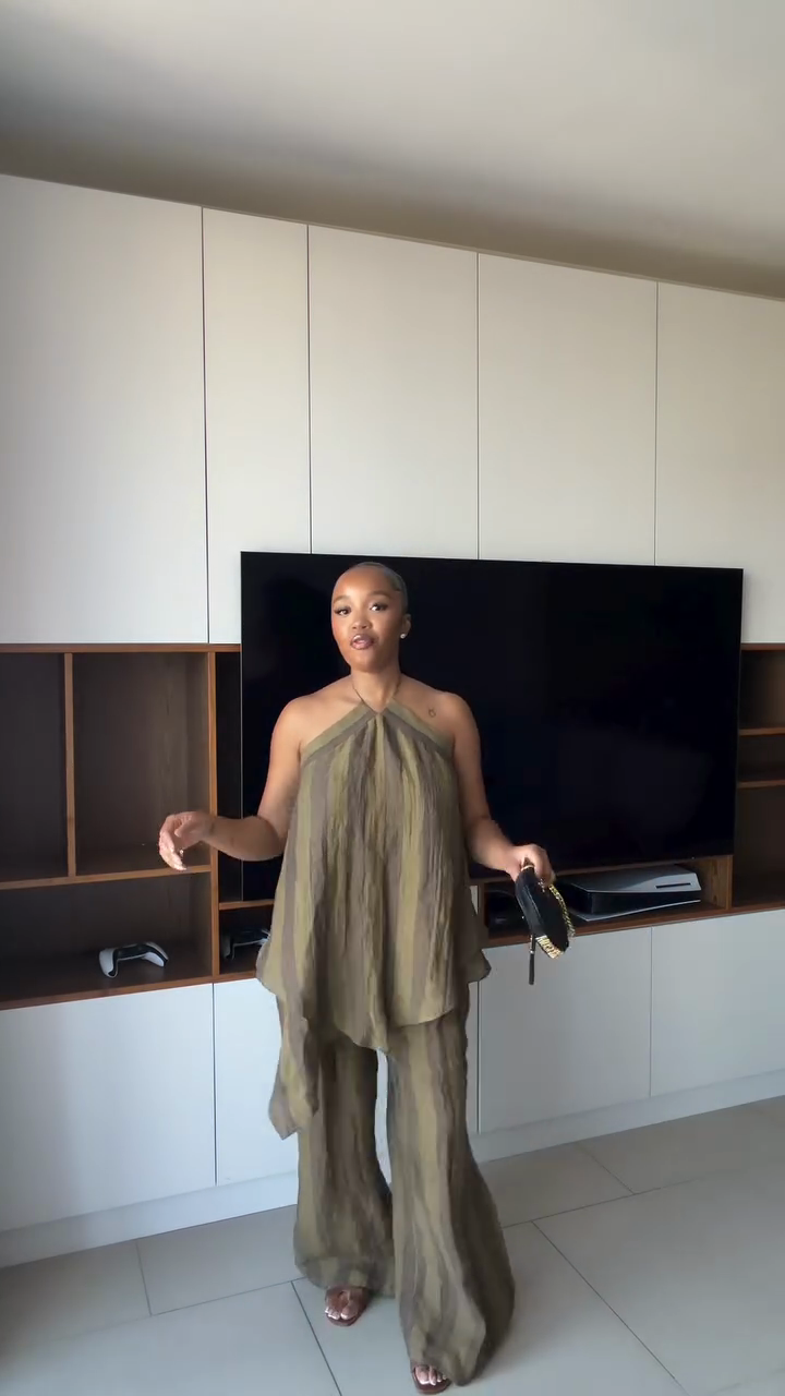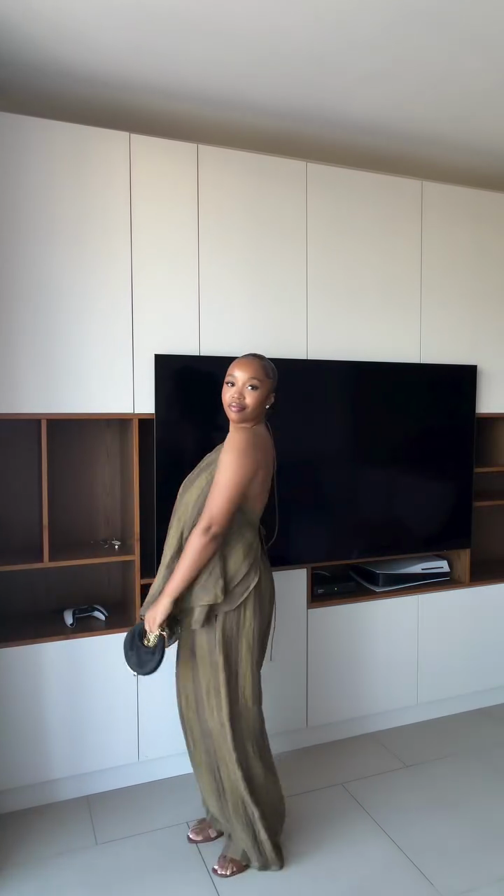 This olive green pleated backless top and wide-leg pants set, made from textured fabric, effortlessly creates a minimalist bohemian style.