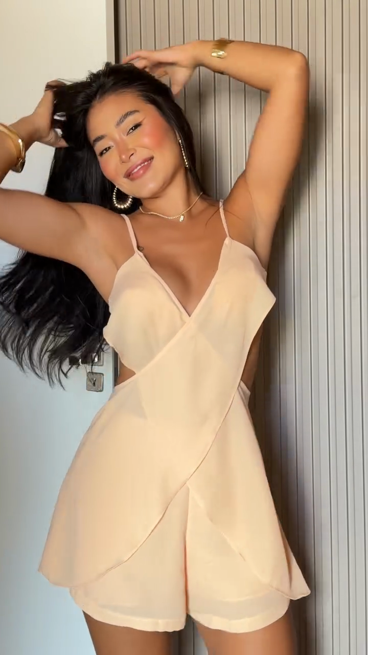 ✅ Lightweight and smooth satin fabric provides a soft and flowing wearing experience. ✅ Adjustable spaghetti straps + V-neck + side cutouts + shorts design create a charming feminine silhouette. ✅ Soft peach hue creates a fresh and vibrant atmosphere. ✅ Easily suitable for brunch dates, rooftop parties, or summer outings, perfect for day or night.