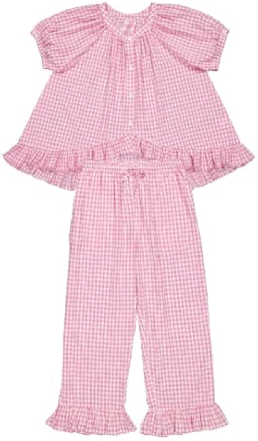 Crafted from a soft and breathable fabric, it ensures comfort during sleep or lounging around the house. Perfect for those who love a cute and comfortable sleepwear option. Details: Design: Pink gingham pattern, button - front top with puffed sleeves and ruffled hem, matching pants with ruffled cuffs Feature: Ruffled details for a feminine touch, soft and breathable fabric for comfort Style: Sweet and classic, suitable for sleep and loungewear Fabric: Cotton Blend Closure: Button - front on top Season: Spring, Summer @Note: Size: please check measurements carefully. Please allow a 0.5 - 1 inch difference due to manual measurement. Different monitor settings may result in slight color variations. 1 inch = 2.54 cm.