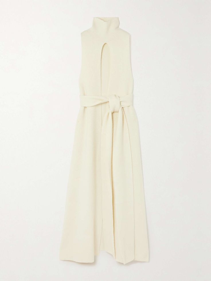 Design: Cream color, sleeveless coat with high neckline and keyhole cutout, tie - waist, matching trousers