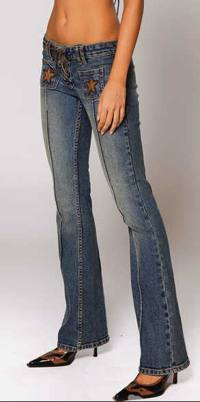 These jeans are made from distressed, medium-wash denim and feature leather star pockets, a front drawstring waistband, and a slim fit. Pair them with a printed cropped t-shirt and ankle boots for an effortlessly stylish look.