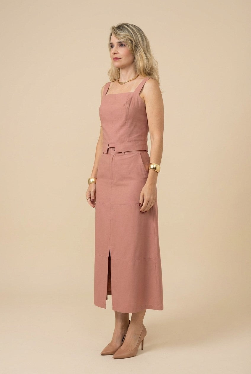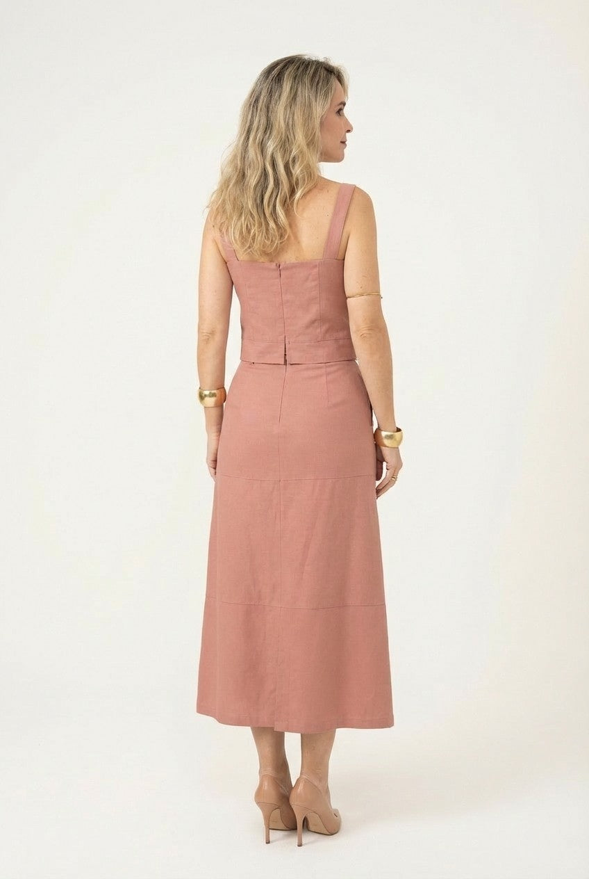 Women's Linen Blend Square Neck Crop Top and Front Slit Midi Skirt Set