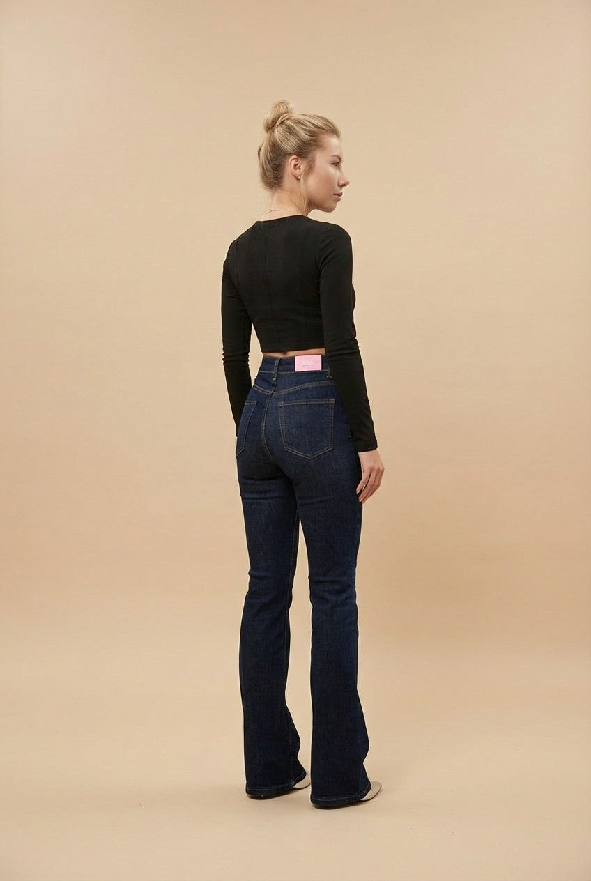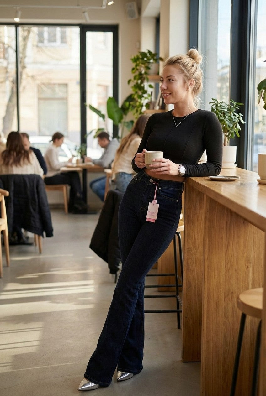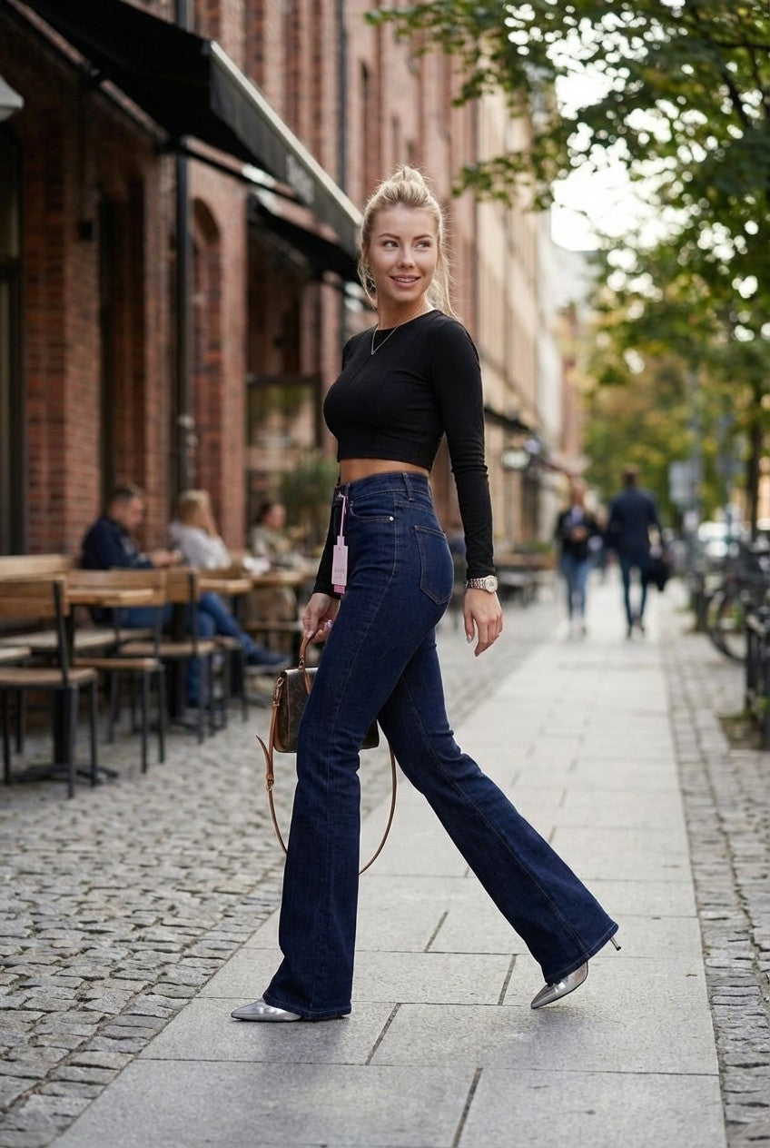 These women’s high-waist flared jeans are designed to create a sleek, elongated silhouette with a modern vintage edge. Featuring a flattering high-rise waist and a fitted hip-to-thigh cut, the leg subtly flares from the knee to balance proportions and enhance leg length.