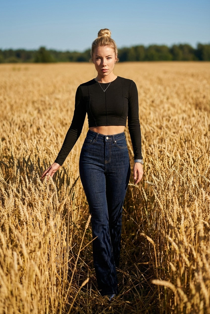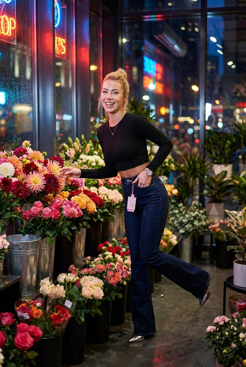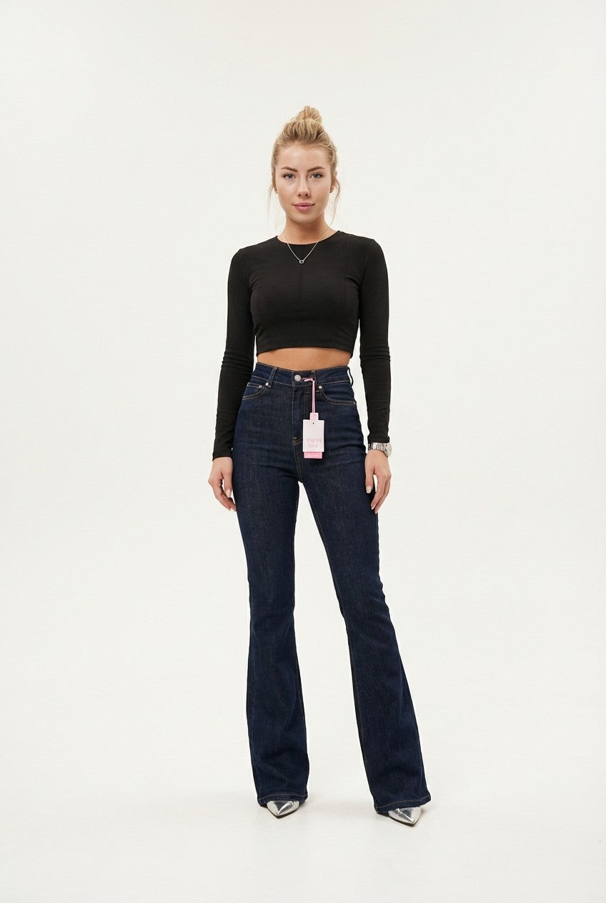 These women’s high-waist flared jeans are designed to create a sleek, elongated silhouette with a modern vintage edge. Featuring a flattering high-rise waist and a fitted hip-to-thigh cut, the leg subtly flares from the knee to balance proportions and enhance leg length.