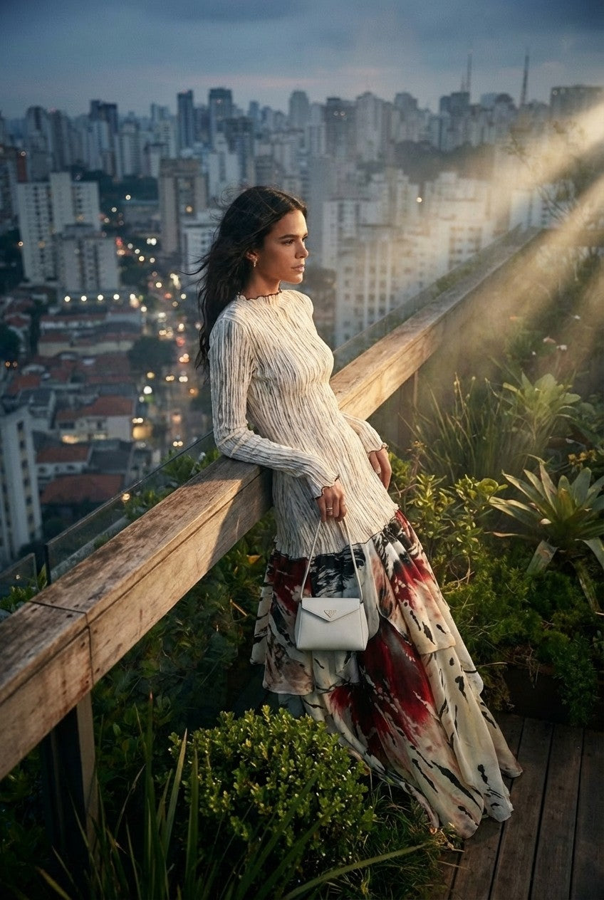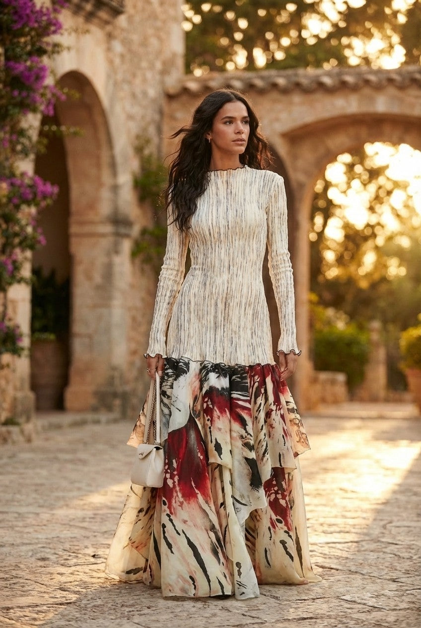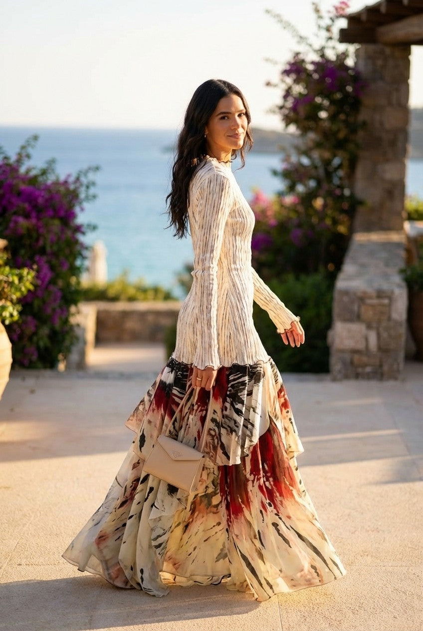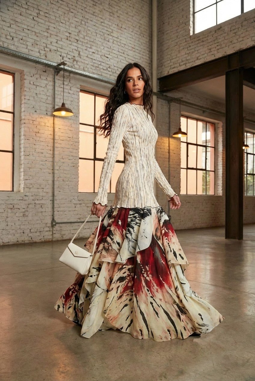 Dramatic Silhouette: A voluminous, tiered ruffle skirt in a bold abstract print offers ethereal motion and high-impact style with every step.