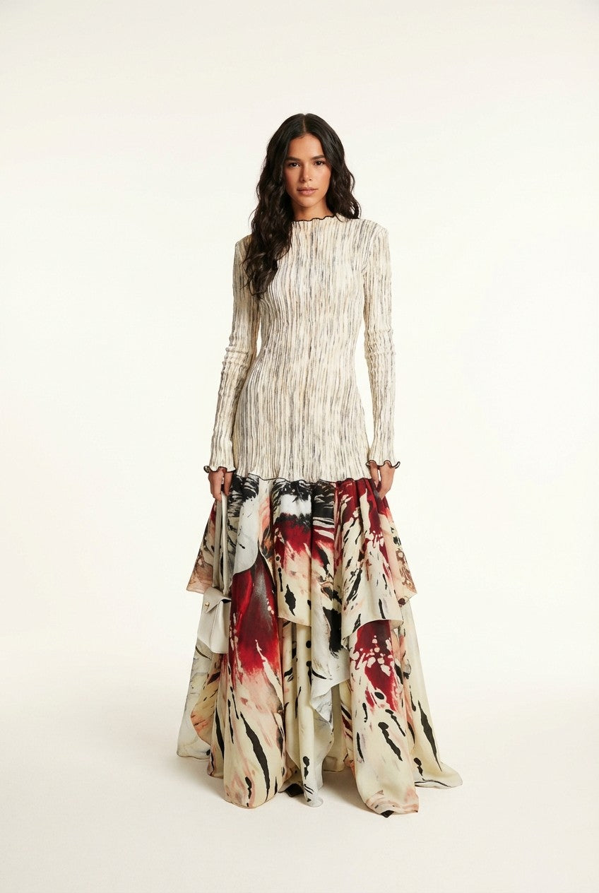 Avant-Garde Appeal: The striking contrast between the minimalist top and the painterly bottom creates a unique, runway-inspired look.