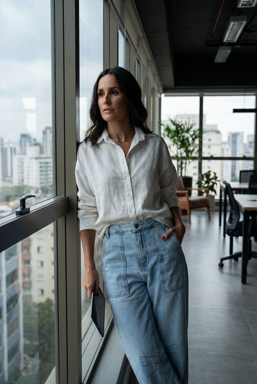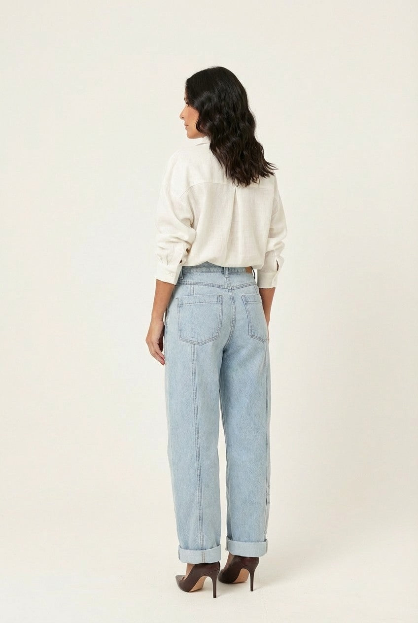 Crafted from premium light-wash denim, they feature distinctive front patch pockets and subtle seam detailing that adds structure without compromising comfort. The high-rise waist flatters the figure, while the relaxed leg offers an easy, laid-back fit that moves naturally with you.