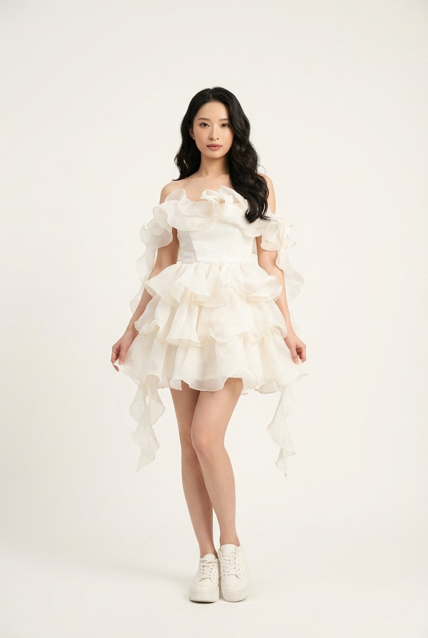 Ethereal charm meets bold design. This stunning white mini dress captures the essence of modern romance with its voluminous ruffles and delicate organza fabric, perfect for making a statement at your next special event.