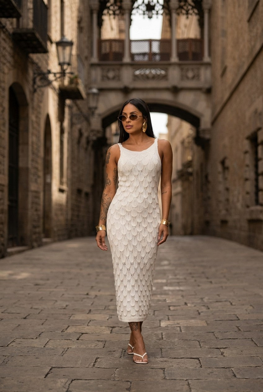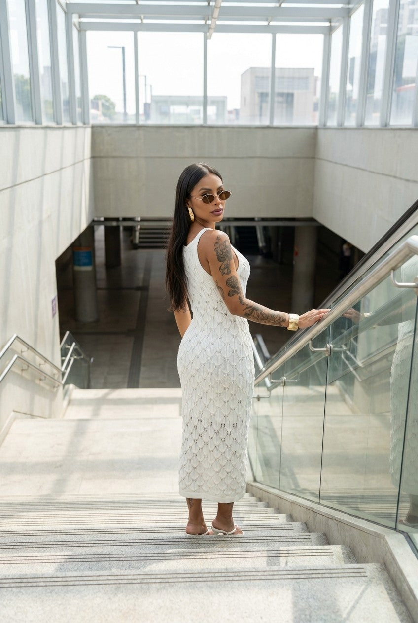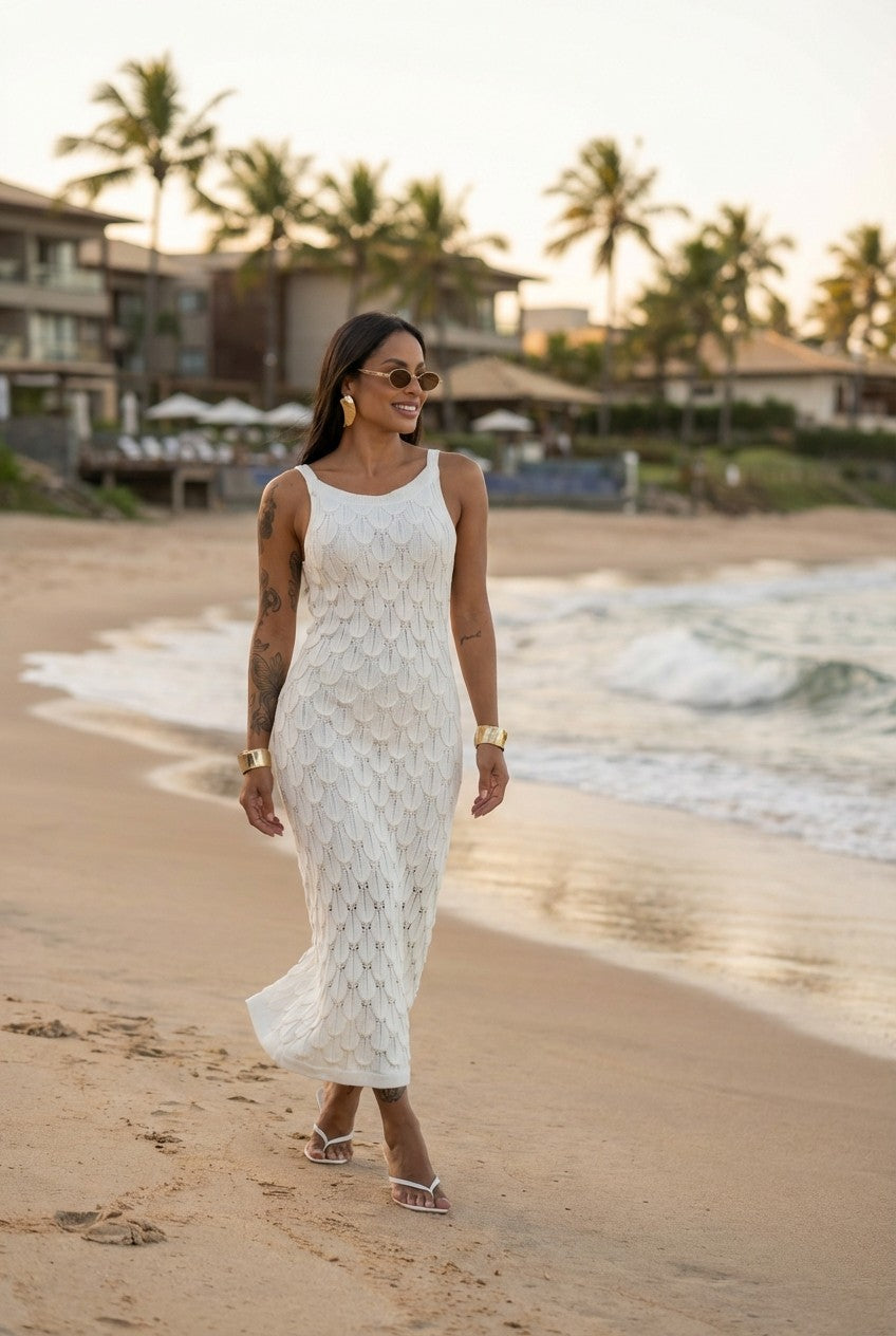 Elevate your summer wardrobe with timeless texture. This stunning white maxi dress features an intricate scalloped crochet pattern that exudes effortless elegance and coastal charm. Designed for the modern woman, it is the perfect statement piece for your next sun-drenched getaway.